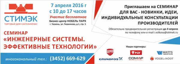 7 апреля с 10.00 до 17.00 в "Нобель-Парке" пройдет семинар компании"СТИМЭКС" на тему "Инженерные системы. Эффективные технологии".