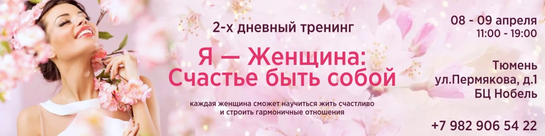 2-х дневный тренинг, пройдя который каждая женщина сможет научиться жить счастливо и строить гармоничные отношения. Программа тренинга не только даст ответы на давно волнующие и одновременно давно надоевшие вопросы. Вы обязательно получите инструменты для создания вашего исключительного и неповторимого счастья.