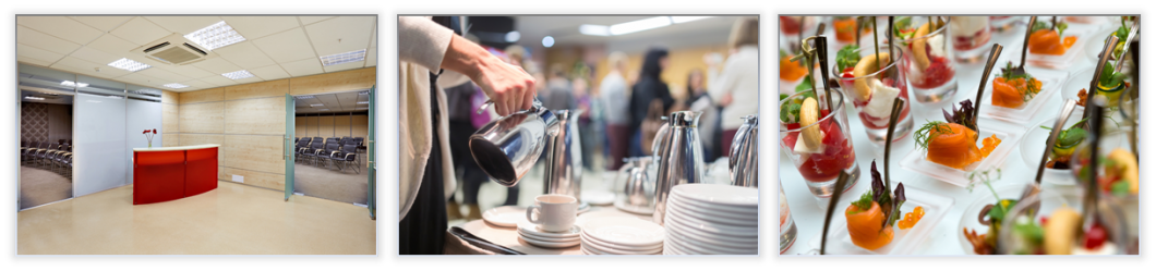 - Дополнительный сервис. В процессе проведения мероприятия вам могут понадобиться кофейные перерывы, деловые обеды для участников, комнаты для переговоров представителей компании с потенциальными клиентами или работы в группах. Поэтому дополнительным преимуществом места проведения мероприятия будет возможность оказания полного комплекса услуг – наличие на территории бизнес-центра кафе или ресторана, холлы для проведения кофе-брейков, залы для переговоров, расположенные в непосредственной близости к вашему конференц-залу. При обсуждении условий проведения конференции заранее обсудите возможность предоставления питьевой воды для участников мероприятия.