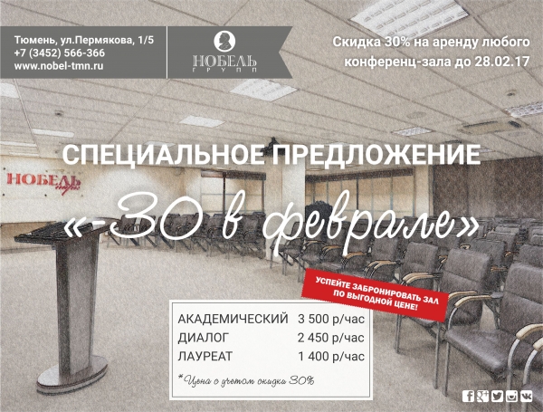 Что такое "-30 в феврале"? Это специальное предложение от компании "Нобель групп" для проведения вашего мероприятия на нашей площадке!